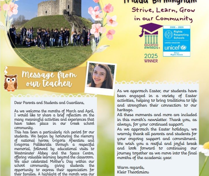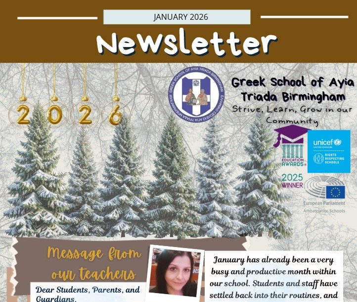 Our newsletters are the heartbeat of the Greek School of Ayia Triada, capturing the essence of our vibrant school life. Each month, we share the latest news, celebrate achievements, highlight outstanding student performances, and provide updates from our EU Ambassador and RRSA articles. Stay informed about current and upcoming events within our school and community, and experience the dynamic spirit that defines our educational journey.